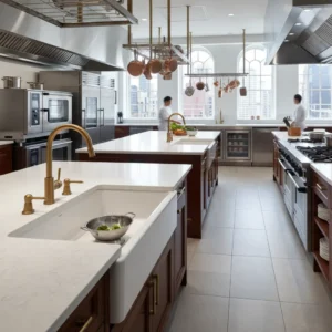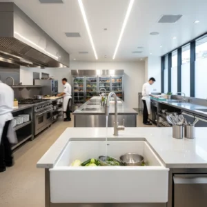 Featured image suggestion: Modern commercial kitchen featuring ceramic sinks in a luxury hotel setting, showcasing both functionality and aesthetic appeal.